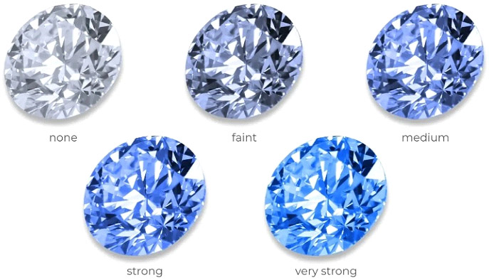 Fluorescence usually has no effect on a diamond's appearance in regular lighting conditions. In some cases, however, a strong blue fluorescence can make a yellow colored diamond appear whiter. In rare cases, it can or cause a stone to appear milky or oily.
