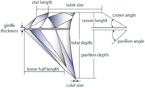 While every diamond is unique, all diamonds share certain structural features. A diamond anatomy, or its basic structure, determines its proportions, brilliance, dispersion and scintillation. Each part of the diamond has a specific name, and having a basic understanding of how each part contributes to the diamond as a whole will help you find your perfect diamond. A diamond is comprised of the eight main components. They are Diameter, Table, Crown, Table Spread, Girdle, Pavilion, Depth, and Culet. Below is a brief description of each part of a diamond and its location.